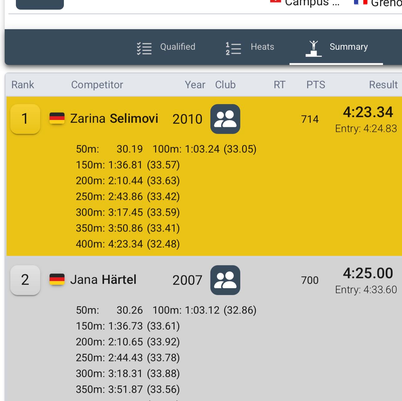 Mariia entscheidet die 400 und 800F für sich und Zarina nimmt Gold über 400F mit. Herzlichen Glückwunsch!