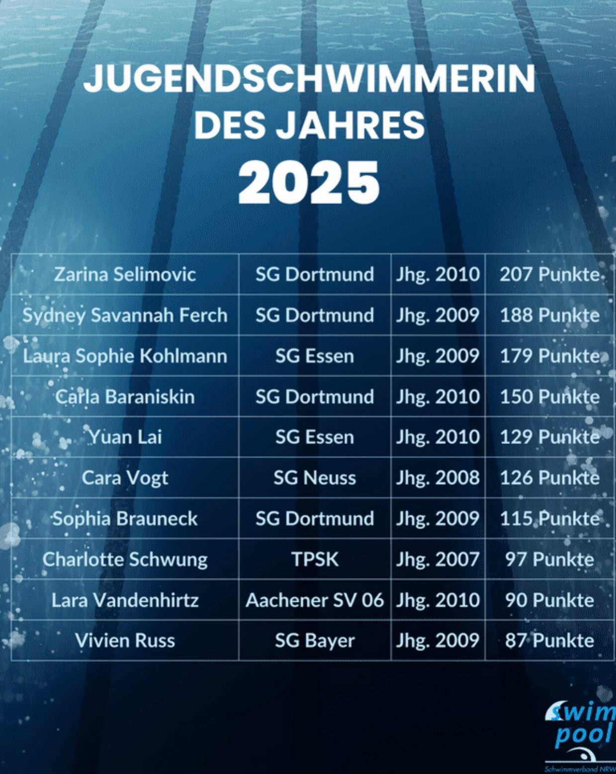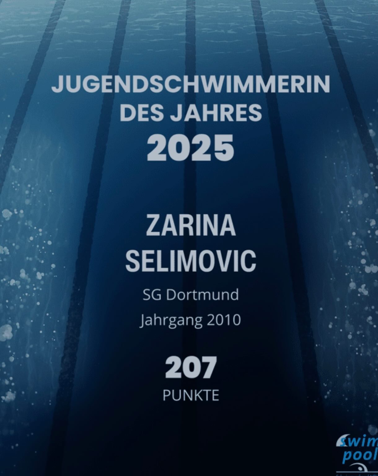 #Jugendschwimmerindesjahres des Jahres 2025 ist Zarina Selimovic @zarina_sel10 ! Platz 2 belegt Sydney Savannah Ferch @sydney.ferch ! Aufgrund ihrer hervorragenden Platzierungen bei nationalen und internationalen Meisterschaften des vergangenen Jahres zeichnet der Schwimmverband Nordrhein-Westfalen Zarina mit dem Titel aus, den sie für uns sowieso schon hat: Jugendschwimmerin des Jahres 2025! ❤️ Herzlichen Glückwunsch!