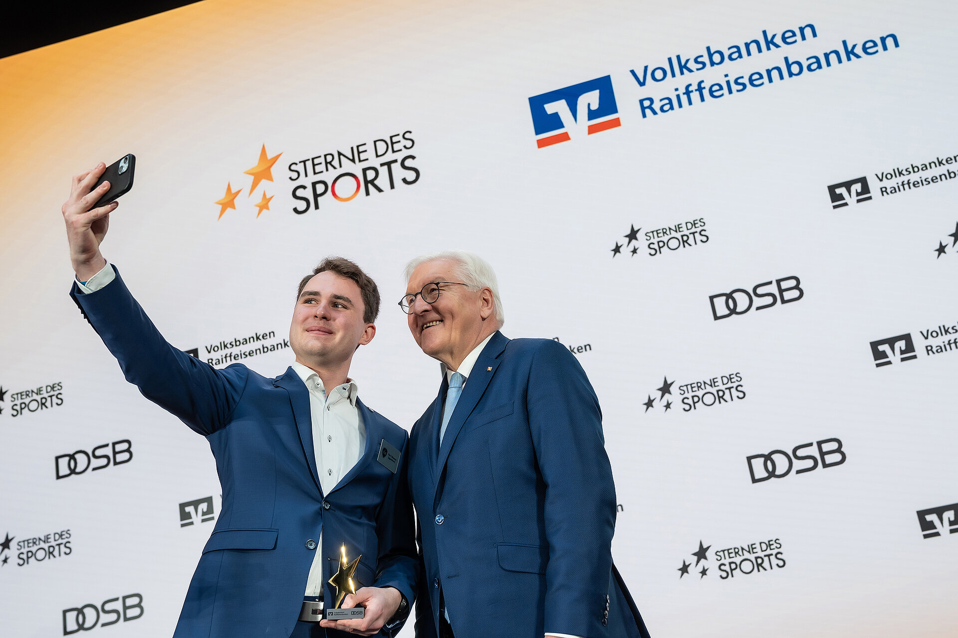 Auf der Anfahrt von Flensburg nach Berlin hatten sie sich darauf geeinigt, die Erwartungen nicht zu hoch zu schrauben. Die Projekte der 16 Mitbewerber um den Hauptgewinn im Bundesfinale „Große Sterne des Sports“ fanden sie zum überwiegenden Teil richtig stark. „Die hätten es alle auch verdient gehabt, ganz oben zu stehen“, sagt Ben Ullmann, als er am Montagmittag in der Zentrale der DZ Bank am Pariser Platz in Berlin sitzt und noch immer etwas ungläubig auf die mittlerweile leere Bühne blickt. Der, der am Ende ganz oben gestanden hatte und ein Selfie mit Bundespräsident Frank-Walter Steinmeier machen durfte, war er gewesen. „So richtig fassen kann ich das immer noch nicht“, sagt er.